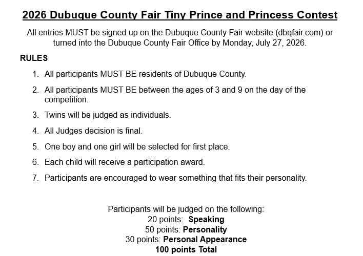 Dubuque County Fair Coloring Contest (Ages 3-11) Age Divisions: 3-4, 5-6, 7-8, 9-11 years old. Winner in each division will win 2 adult admissions and $10 in Fair Bucks! 1 entry per contestant.